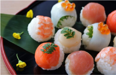 必要な材料は、サーモンやマグロ、イカ、ホタテなどの刺身、薄焼きたま ご、むきえびなどお好みの具材でOK。具材が大きい場合は、1口大にカットし ておきます。ご飯が炊きたての熱いうちにすし酢を加える。 ご飯にしっかり酢を吸収させます。