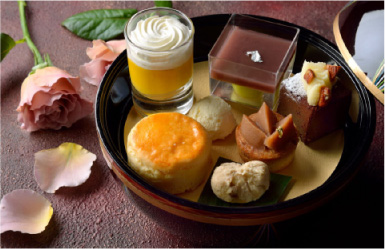 かぼちゃやさつまいも、栗など、秋の味覚がふんだんに使われています。 ふくらみのある辛味や酸味が特徴の「漱石 百寿」を生地にたっぷり染み込ま せ、かぼちゃのクリームと楽しむ和のサバランや、バターを使用せず山廃仕込みな らではのどっしりとした旨味を感じる「漱石 碧寿」を使ったマロンクリームが特徴 のガレット。